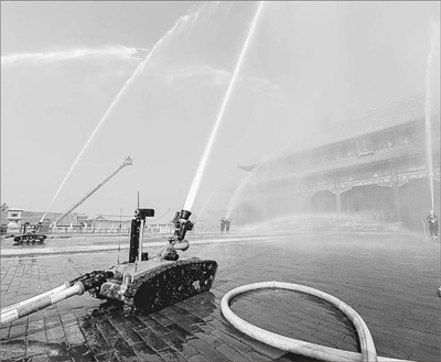 今年“10·10”故宮博物院九十一歲華誕。故宮昨日在太和殿區(qū)域進(jìn)行了建院史上最大規(guī)模的消防實(shí)兵演習(xí),以此慶生,“防爆消防滅火偵查機(jī)器人”也因此首次在故宮“滅火”。